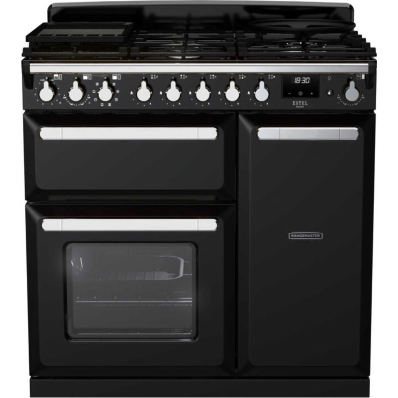 Rangemaster ESDL90DFPGBLCM1 Estel Deluxe 90 Dual Fuel Gloss Black - with Chrome Trim