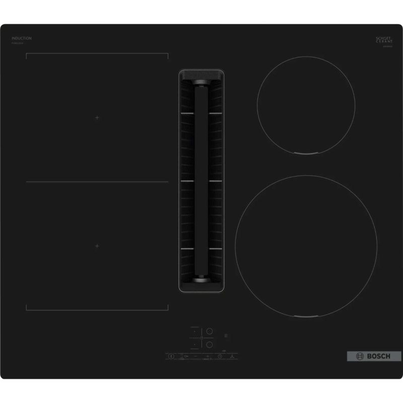Introducing the Bosch PVS611B16E Series 4 60cm Ventilation 4 Burner Hob in sleek black, a kitchen innovation that combines induction cooking with integrated ventilation for a seamless cooking experience. With its advanced features and stylish design, this hob is sure to elevate your culinary endeavours.