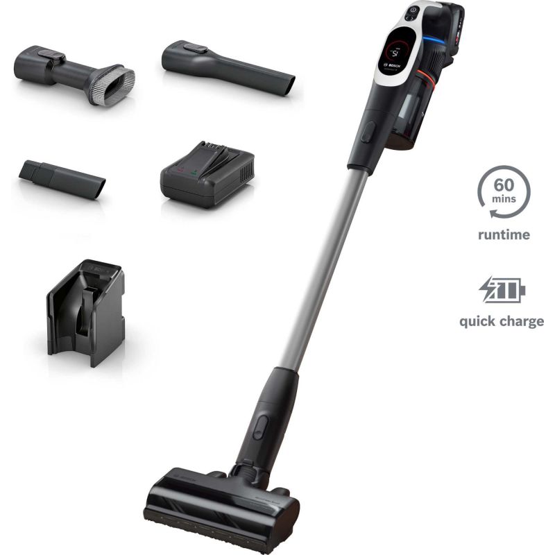 Introducing the Bosch Unlimited 9 BBS931WGB Bagless Stick Vacuum Cleaner in striking white, designed to revolutionise your cleaning routine with cutting-edge technology and effortless performance. Engineered with MicroClean Technology, this innovative vacuum ensures superior cleaning results by capturing even the smallest particles and allergens, leaving your home truly spotless.