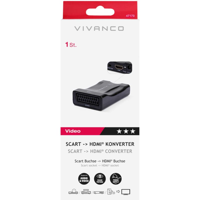 In addition to its superior performance, the Vivanco 47173-SCART2HDMI converter boasts a sleek, black finish that complements any entertainment setup. Its compact design ensures it fits neatly into your home theatre system without taking up much space.