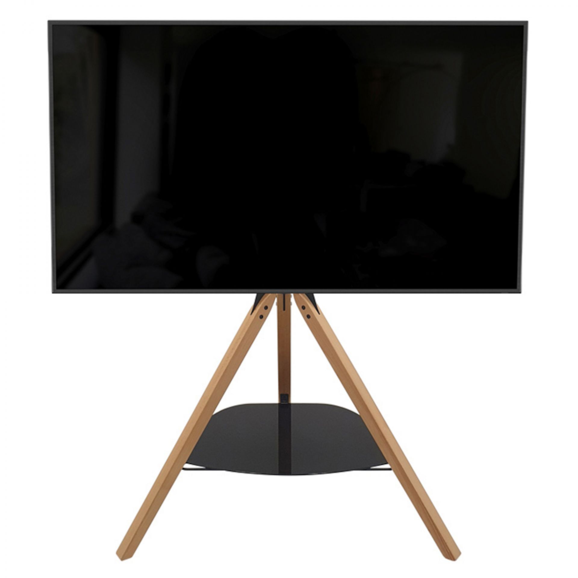 It features three light wood legs with a single black safety glass shelf for media devices. This AVF TV Tripod TV Stand features 15 degrees of adjustable tilt which can be achieved without the need of any tools, making it perfect for avoiding light glare and reflections. The steel column section incorporates cable management holes, allowing unsightly wiring to be discreetly guided away from the TV and through clips down the rear leg, while still allowing height adjustment, so screens can be positioned at the desired viewing height.