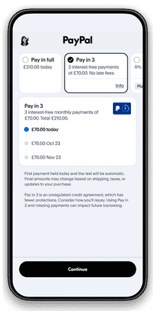Need a little flexibility at checkout? PayPal Pay in 3 lets you divide your purchase into three equal payments, with the first paid today and the rest automatically collected each month. There’s no interest, no setup fees, and no surprises. Just a simple way to spread the cost when it suits you.