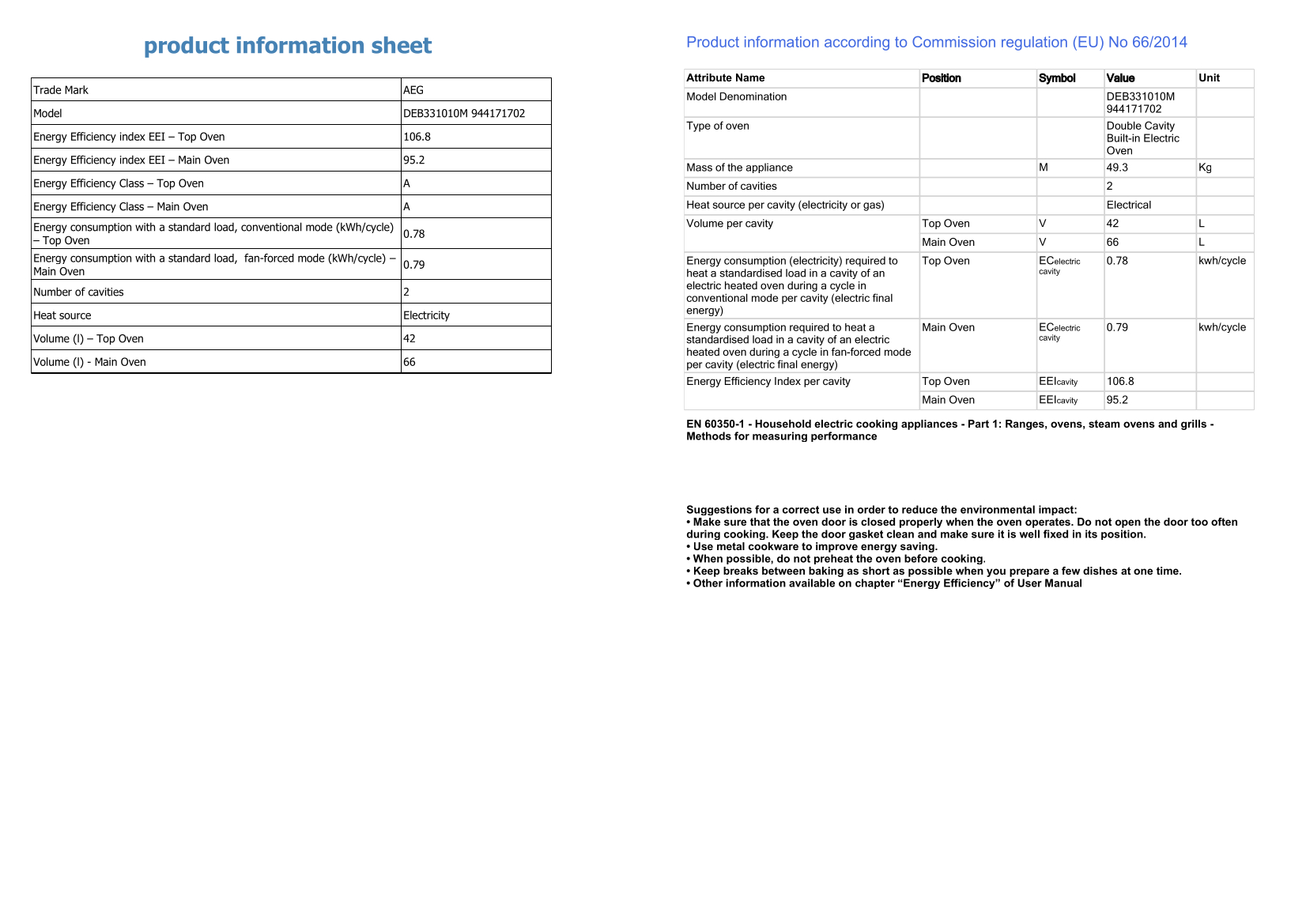 - Energy Efficiency Class A+ helps lower your energy bills while cooking and baking.